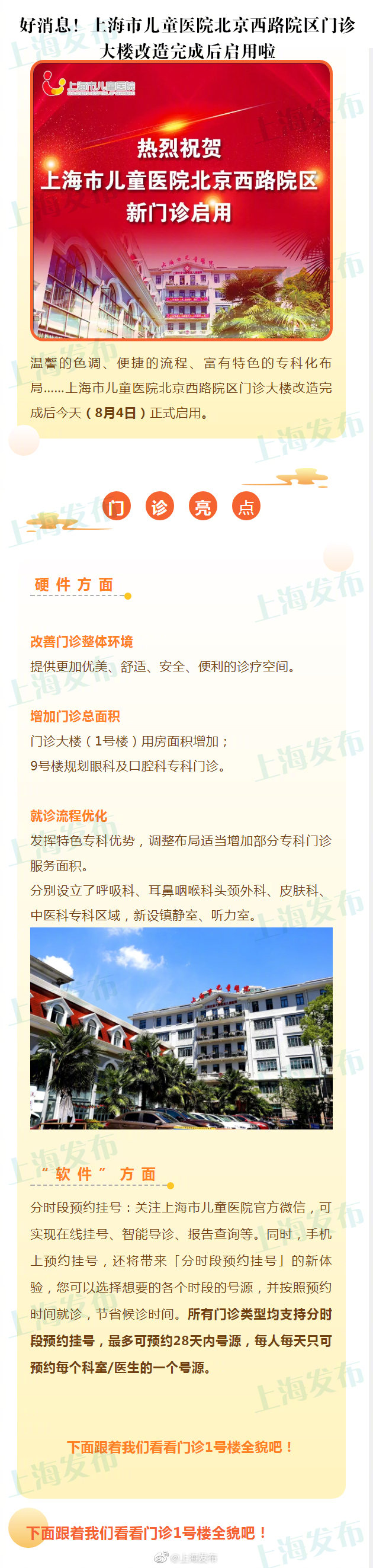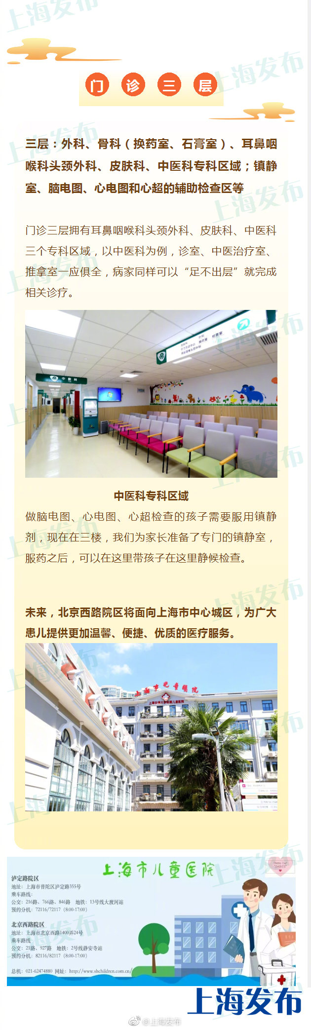 【市儿童医院北京西路院区门诊大楼改造完成启用啦】#便民提示#爸爸妈妈们看过来~@上海市儿童医院 说,北京西路院区门诊大楼改造后增加了门诊总面积,患者无需在门诊挂号窗口大排长龙,门诊34台自助挂号机将方便就诊患者挂号收费;门诊二层的呼吸科专科区域优化了流程,集中了呼吸科诊室及脱敏治疗室、雾化中心、肺功能室等呼吸科常规治疗室,使病人不用往返奔波,在同一区域就能完成常规治疗。更多详情↓