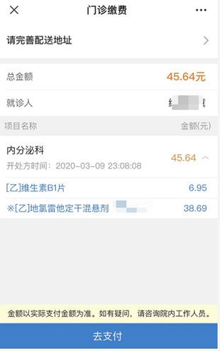 其中医保患者收到线上待支付处方单,点击“支付并配送到家”,进入缴费界面,点击“去支付”。