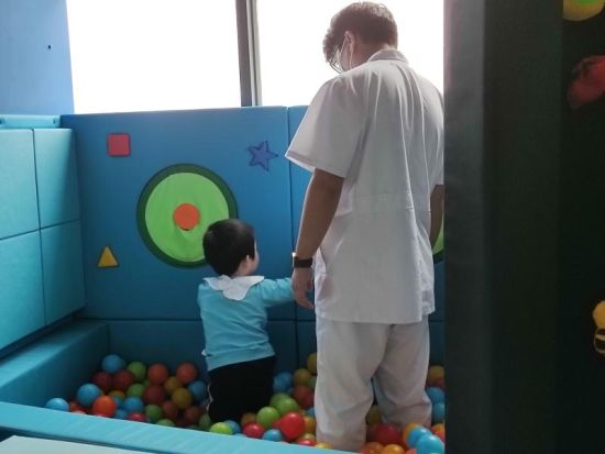 这是今年儿童医院接受康复治疗的第二个“植物人”,与之前曾报道的“篮球少年”相比,明明的病情更重,病程更长,植物人促醒的难度更大,医务人员面临的压力和挑战更大。不过在康复治疗中,他们还是从孩子的眼神中看到了希望的微光——“尽管只有3岁,但明明想要重新站起来的信念非常强。”根据冯主任的植物人促醒康复计划,在康复师沈统的帮助下明明从跪到坐,从坐到站,一点一滴的进步。由于康复的过程枯燥且伴随疼痛,小朋友偶尔会出现排斥和拒绝配合,为了应对这样的问题,康复治疗团队一起使用更有利于儿童的康复方式,把康复和游戏相结合,为了训练孩子四肢自主活动,会把他放在海洋球中尽情“游泳”,让他用海洋球丢远处的玩具训练手臂肌肉,在五颜六色的海洋球粒,明明更放松,完成任务也更主动,恢复更快。