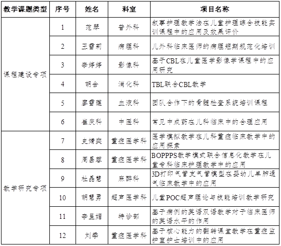 希望通过院级教学课题的开展,加强我院教学研究的实效性与针对性,培育更高级别的教学研究项目,扶植一批具有一定基础的儿科专业主干课程,助力提升我院学生临床基地的内涵建设和临床教学质量。