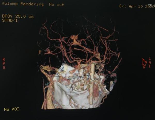 孩子家长都吓坏了,他们立刻抱起浩浩直奔当地医院,经过两次转院,由于情况紧急,还来不及等到检查报告出来,就转来上海市儿童医院,此时已是10日凌晨3点多,距离筷子插进脑部已有8小时。儿童医院神经外科、耳鼻喉头颈外科联合影像科紧急会诊。通过头部CT及CTA血管造影发现,折断的筷子已经插入浩浩颅内五厘米深,而且位置十分凶险:右侧就是眼球,左侧是大脑前动脉,四周都是重要的结构,可谓“步步惊心”。