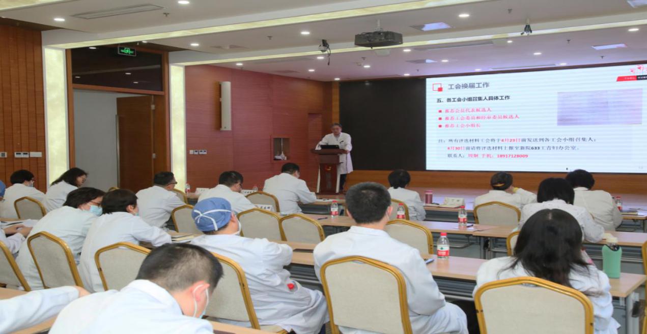 2021年4月19日下午,我院工会第十五届换届动员大会在泸定路院区顺利召开。会议由党委副书记刘海峰主持,医院党政领导及第十四届工会委员、各工会片区召集人、各党支部书记在现场出席,各工会小组长在钉钉线上参会。