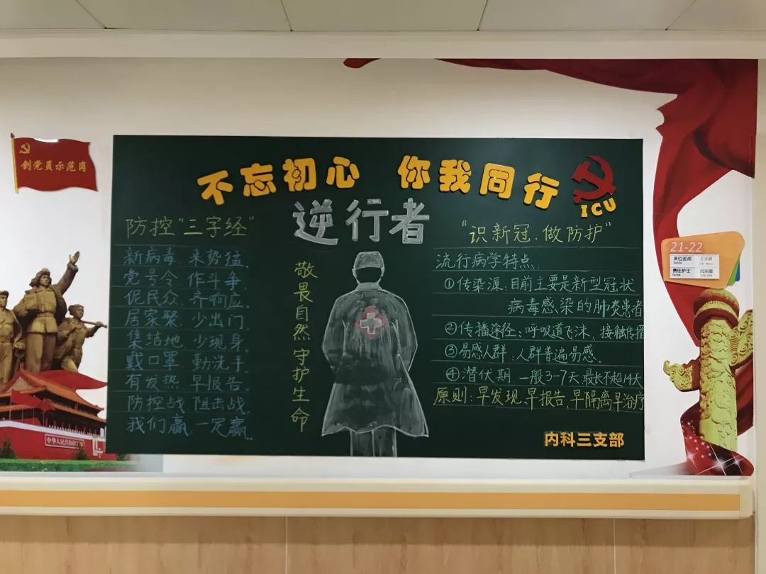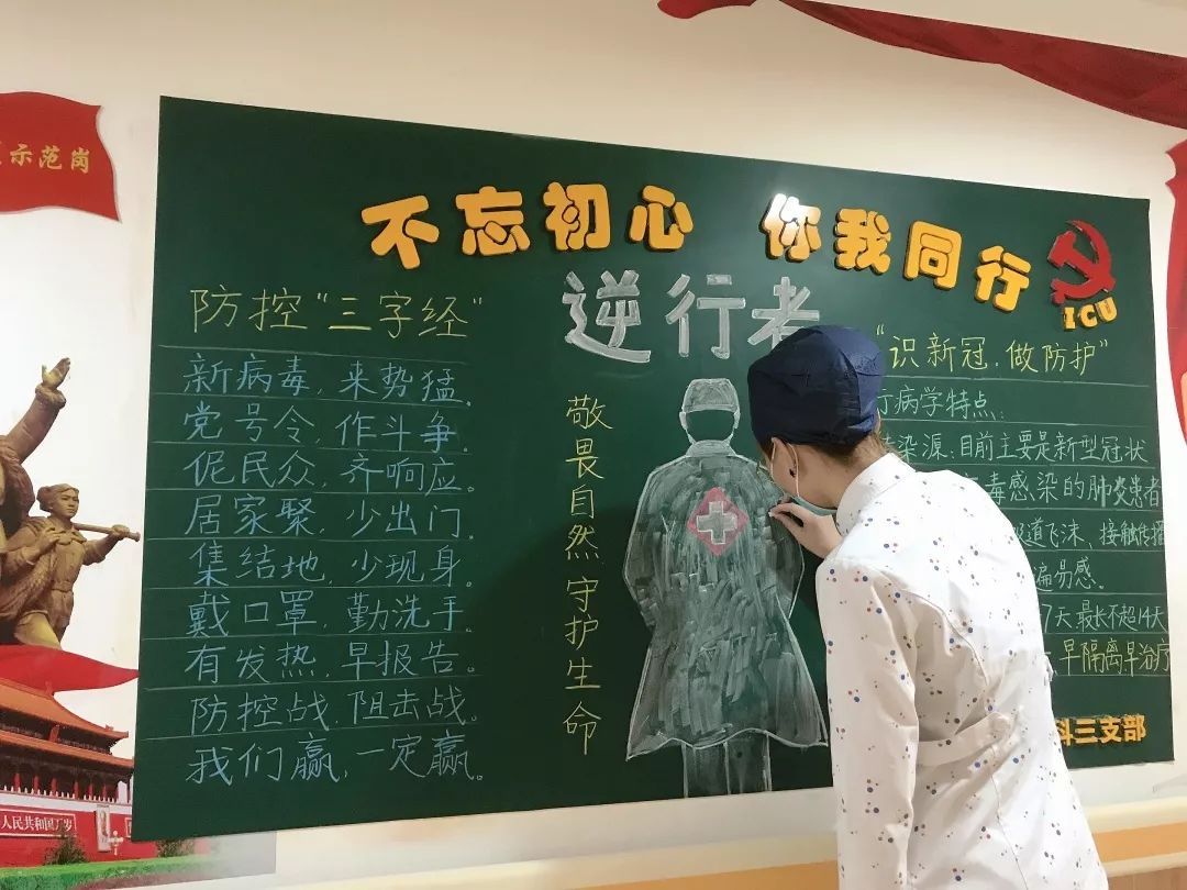 一首朗朗上口的疫情防控“三字经”,一篇简单易懂的“识新冠,做防护”科普文章,配上一幅简洁有力的“逆行者”粉笔画,这幅简单出彩的宣传板报,出自内三支部的党员护士吴欢欢之手。