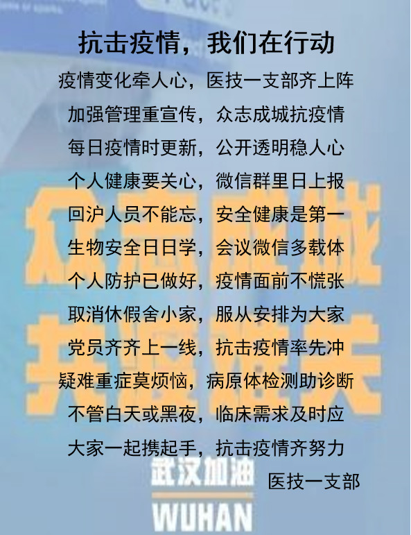 “疫情变化牵人心,医技一支部齐上阵。加强管理重宣传,众志成城抗疫情……”医技一支部孟磊俊从小年夜开始就进入了“战疫”状态,一次为了一份检测报告一直工作到了凌晨4点,就连睡梦中,都牵挂着疫情防控。几天前,清晨醒来之时,连日来的所见所闻,科室同事,医院同仁们为迎战疫情昼夜奋战的身影清晰地浮现在了她面前,她灵感“喷涌而出”,拿起手机,直接在微信中编辑了一首百余字的“战疫诗”,并且很快发布在了科室微信群中,后由支部书记张泓转发,引起了全院巨大的反响。