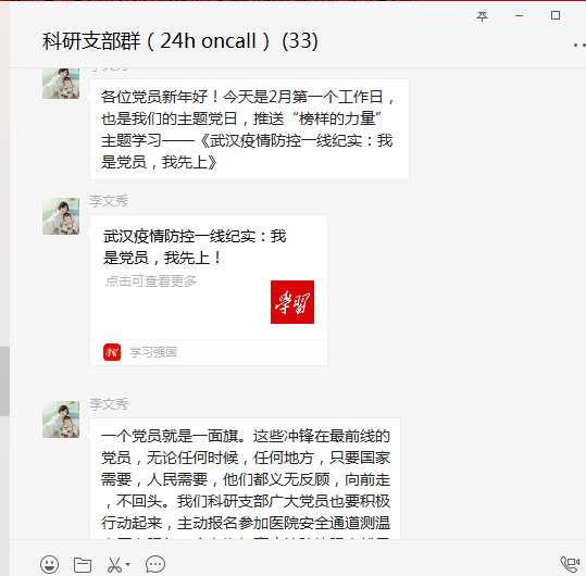 2月的第一个工作日,也是科研支部的主题党日,在人员分散的情况下,科研支部在微信群推送了“榜样的力量”主题学习——《武汉疫情防控一线纪实:我是党员,我先上!》通过主题学习,号召支部广大党员积极行动起来,投入到这场伟大的斗争中去。宣传和鼓舞的作用是立竿见影的:在医院安全通道测温志愿者行动中,科研支部17人先后报名参加,除了病假、产假、学生和在闵行上班的党员,全部上阵,还有许多非党员也报名参加志愿者活动。