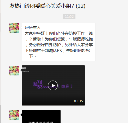 团委通过手机视频连线,加强与一线青年医务人员的沟通,关心其思想、工作和生活情况,了解青年职工需求,帮助解决实际问题,同时为发热门诊青年医务人员发送人文关怀相关信息,帮助青年放松身心。