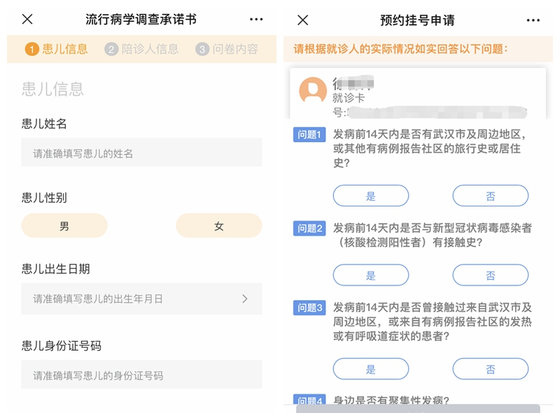 为加强入院人员信息登记的便捷性,缓解预检人员工作压力,信息部协同门办第一时间设计上线了自助流行病学问卷调查表,包括自助机挂号时、微信预约时、二维码直接扫码等多个渠道,目前每天近1500名患儿家属进行了信息填报。