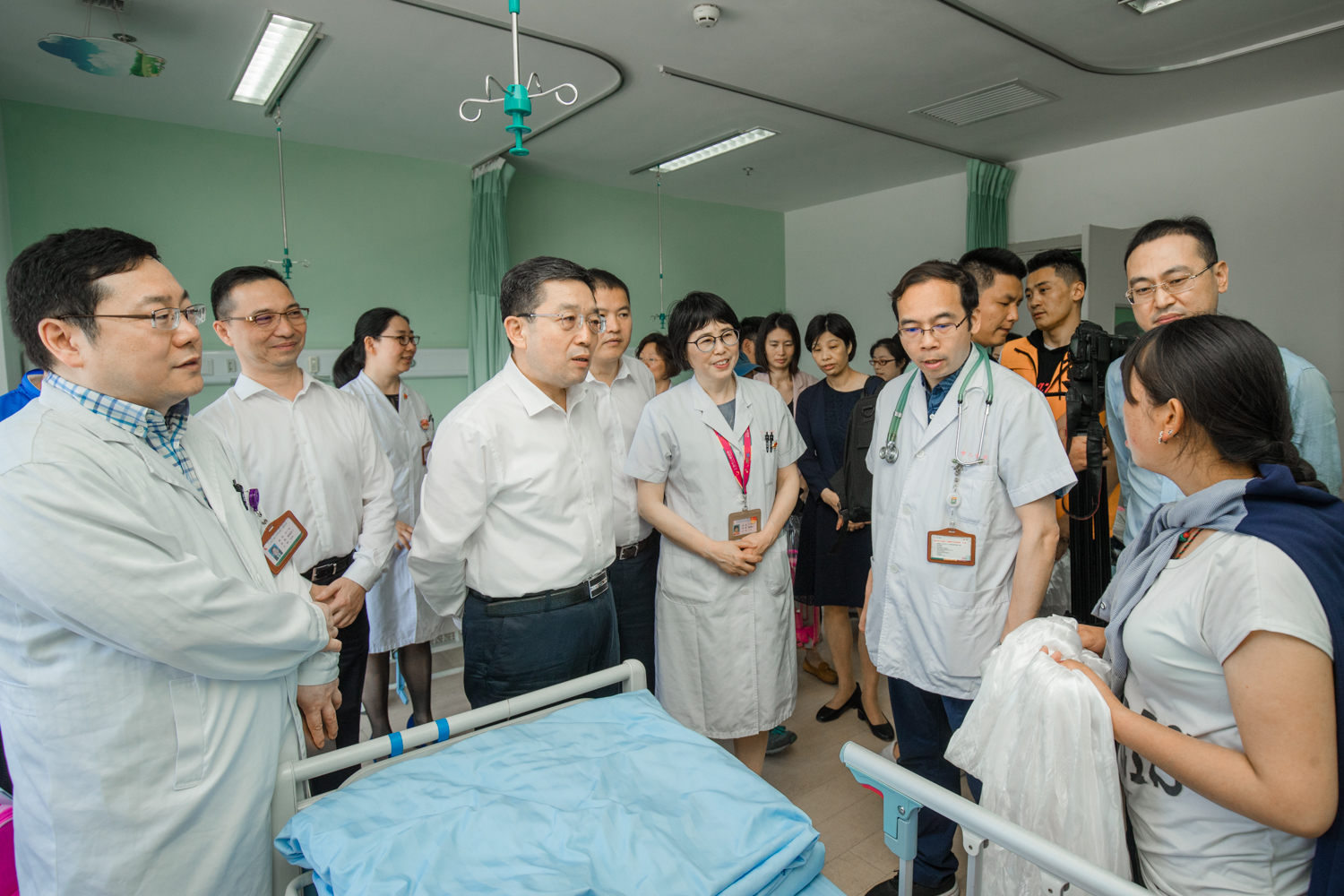 郑钢淼部长与医护人员、患儿家属亲切交流,详细询问孩子们的病情、治疗和康复情况