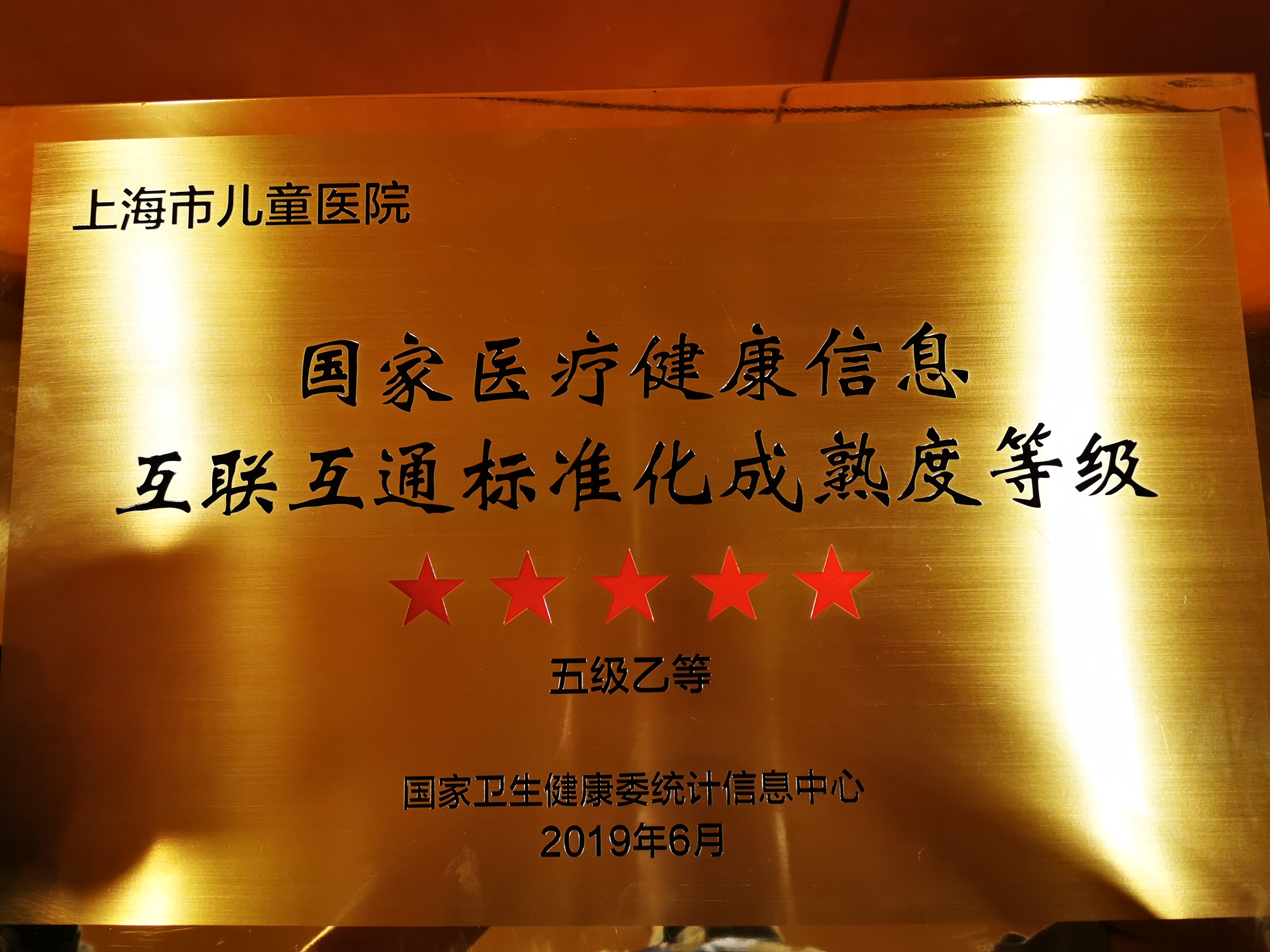 2019年6月20日,2019年度中国卫生信息技术/健康医疗大数据应用交流大会在西安举办,大会发布了2018年度国家医疗健康信息互联互通标准化成熟度测评结果,上海市儿童医院成为上海首家通过互联互通标准化成熟度测评五级乙等的儿童专科医院,由医院影像科报送的“骨龄人工智能诊断技术落地医院真实场景及一键式临床应用”获得2019年度医疗健康人工智能应用落地30最佳案例。儿童医院党委副书记、院长于广军代表医院参加授牌仪式。