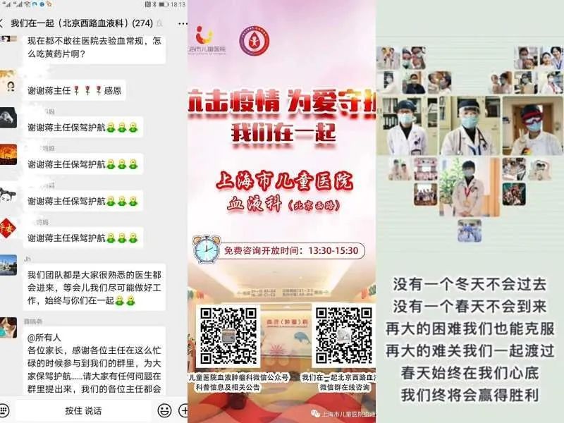 自新型冠状病毒来袭,内二支部血液肿瘤科医护团队始终心系患者。在节日期间开设定时定人的电话咨询,由主治以上级别的专科医生解答病情。由于疫情蔓延,全国多省市启动了重大突发公共卫生事件一级响应,交通出行受到一定影响,血液科又启动了医患微信群内的咨询。学科带头人蒋慧教授亲自挂帅,内科第二党支部邵静波书记积极带头响应和召集专科医师,放弃自己的休息,在幕后回答咨询。上班的医护人员负责把住院病人和门诊病人安排治疗好,休息在家的医生则负责微信上解答外地及来院不便的病人。大家齐心协力,只为让患儿及家属能够安心,避免不必要的奔波,保障患者安全。血液科薛晓燕护士长平时带领专科护士团队一直维护着这个名叫“我们在一起(北京西路血液科)”医患微信群的运作,此时此刻发挥了巨大的作用。