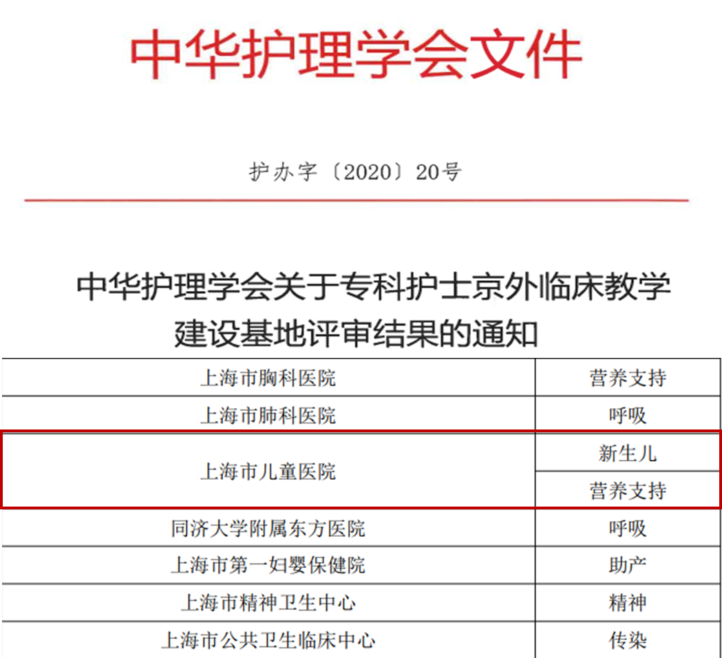 发展专科护士队伍,提高专科护理管理水平是“十三五”期间的一项重要工作,上海市儿童医院紧跟《全国护理事业发展规划(2016-2020年)》步伐,积极开展专科护士培训工作,不断提高专科护理服务水平,切实落实优质护理服务,积累了丰富的专科护士培训经验。9月21日,接中华护理学会文件《中华护理学会关于专科护士京外临床教学建设基地评审结果的通知》,我院新生儿专科和营养支持专科成功入选中华护理学会专科护士京外临床教学建设基地。