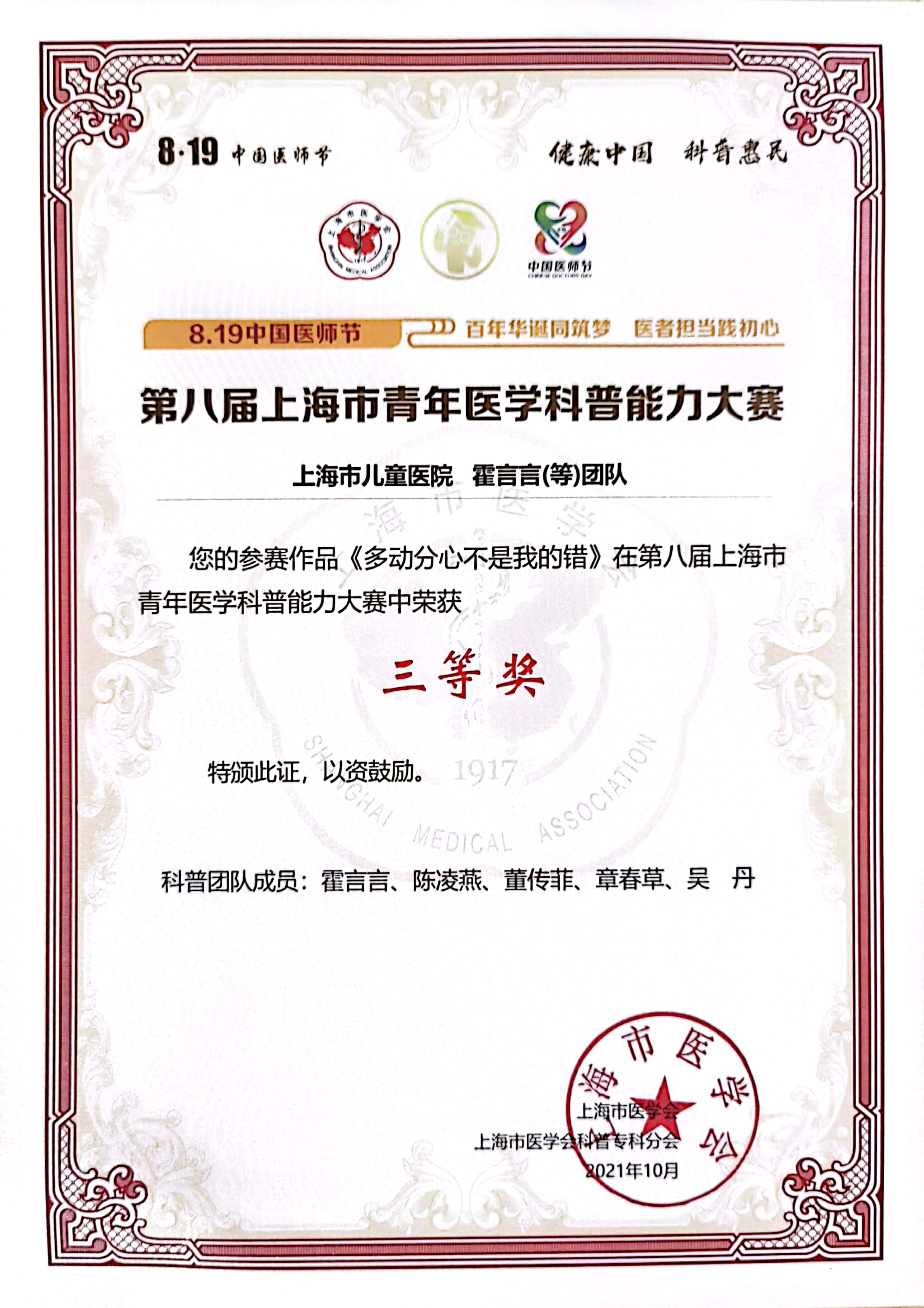 2021年10月13日,由上海市卫生健康委员会指导、上海市医学会主办、上海市医学会科普分会承办的“第八届上海市青年医学科普能力大赛” ,在上海虹桥郁锦香酒店举行。