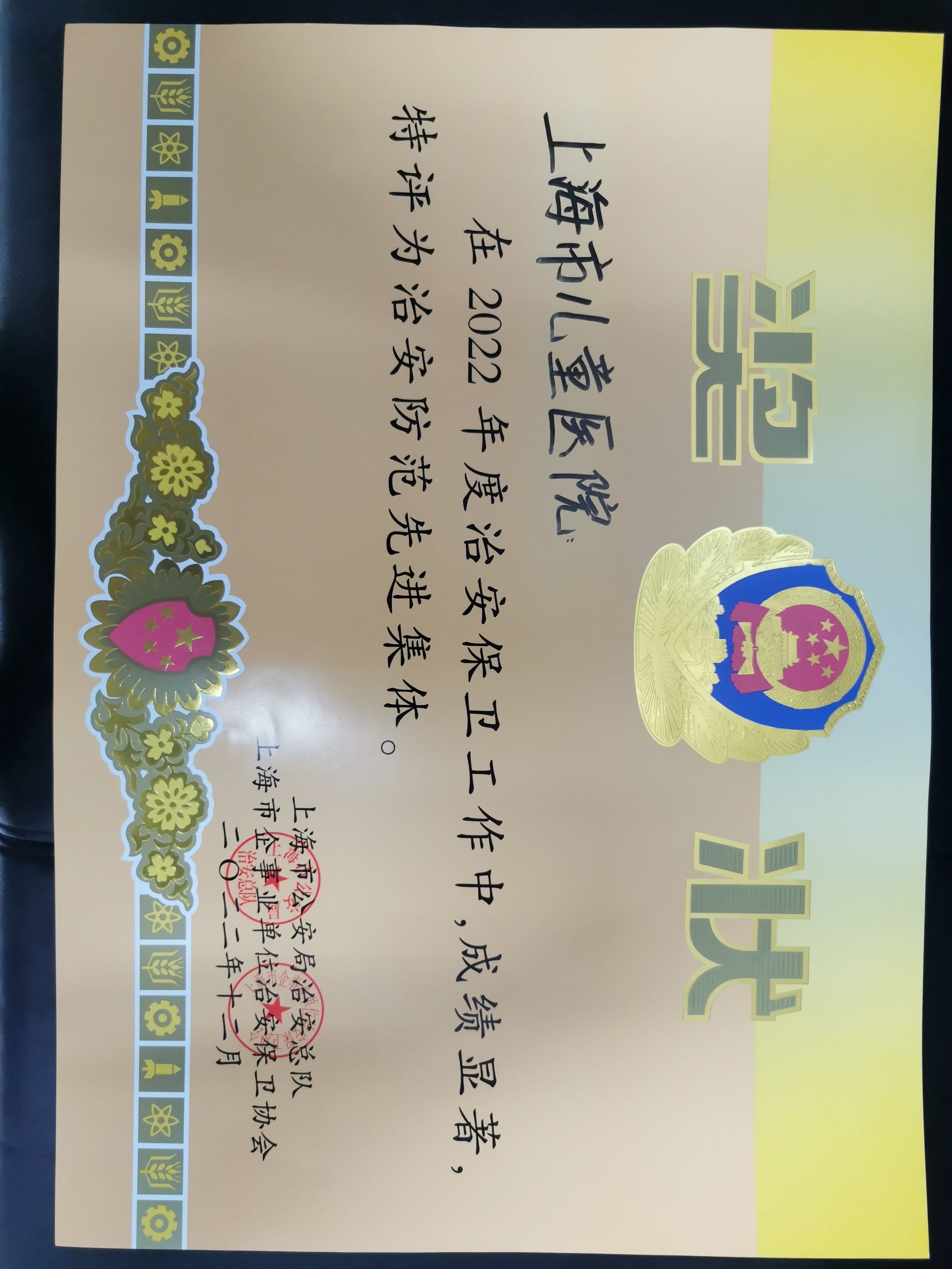 2022年12月,上海市公安局治安总队、上海市企事业单位治安保卫协会组织先进单位和个人评选,我院荣获2022年度上海市企事业单位“治安防范先进集体”“疫情防控工作先进集体”称号和“内保征文活动一等奖”,保卫部荣获“先进保卫组织”。