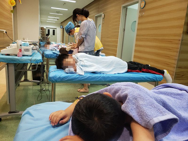 一边用iPad看着《西游记》,一边享受着妈妈的轻抚,4岁的铭铭(化名)舒舒服服地躺在床上享受着中药穴位敷贴。周一的上海阴雨蒙蒙却依旧抵挡不住家长和孩子们对于中医敷贴的热情,敷贴室的床位上,患儿一个接着一个,络绎不绝。