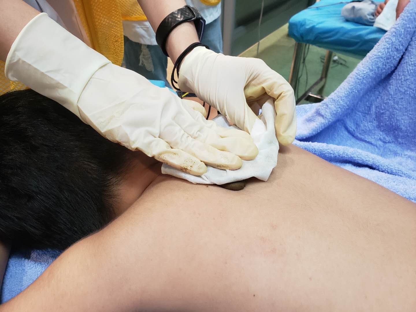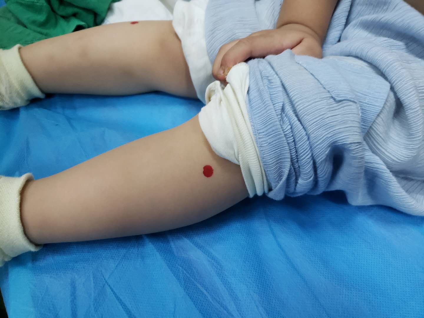 20分钟的“大敷贴”很快过去,铭铭自然地坐了起来,这位“敷贴老手”显然习惯了接下来的步骤。果然,医护人员带着记号笔走了过来。