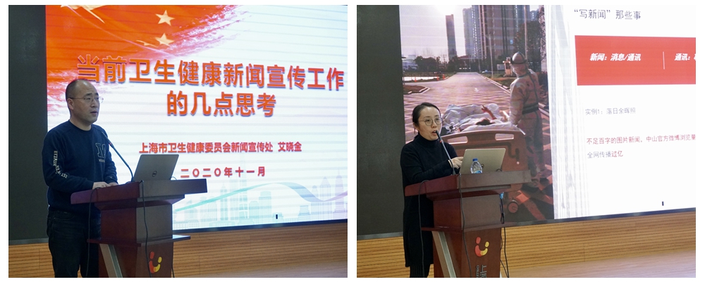 艾晓金处长就当前卫生健康系统新闻宣传工作进行了讲解,介绍了疫情防控下新闻宣传工作的基本情况,表示宣传人员应重视重要信息发布和政策解读,提高政治站位,听指挥、对口型、看手势,站在意识形态的高度谋划宣传工作。齐璐璐科长结合中山医院自身发展经验,分享了写新闻的那些事儿,她指出,在撰写新闻稿时,应要用民众听得懂的话,把握要点,深入浅出,同时更要突出创新价值。