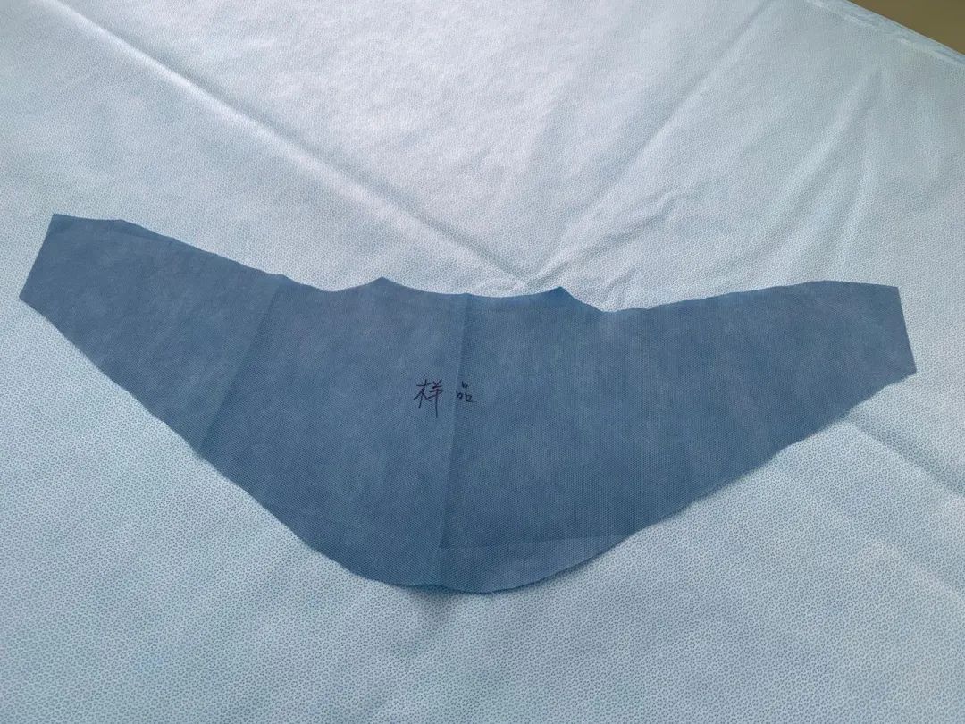 目前市面上常用的一次性手术隔离衣均为圆形低领设计,此类防护服穿着后医务人员的脖子和工作服衣领均暴露在隔离衣外,容易受到飞沫的污染,造成医护人员的感染。就目前国内和国际疫情发展情况看,防控工作仍会持续一段时间,防疫物品仍然有较大的缺口。为了能让包括门急诊预检、呼吸科、消化科、重症监护室等科室在内的重点岗位医护人员得到最大限度的防护,又能节约防护用品,在护理部陆群峰主任的牵头下供应室自行设计了一款一次性简易防护围脖。