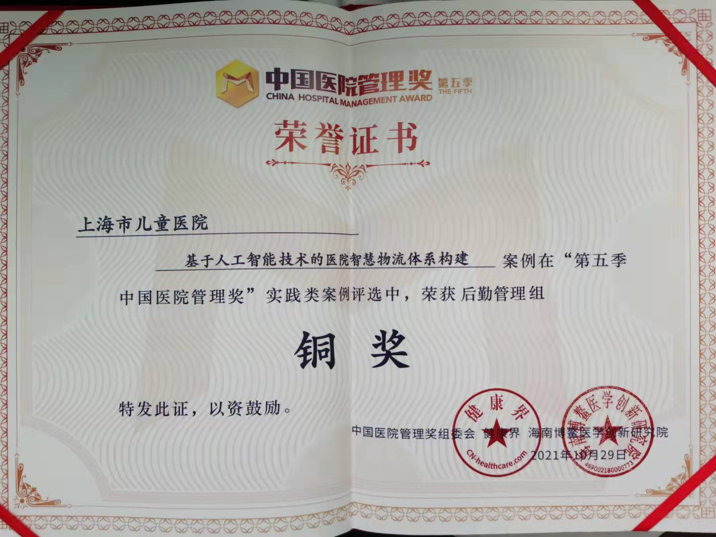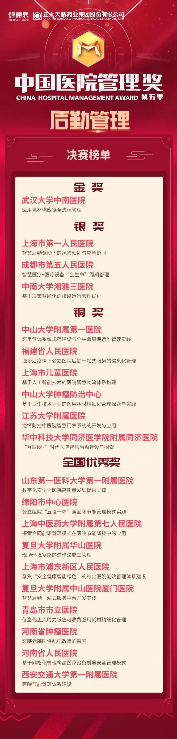 2021年10月29日,由中国管理科学学会、中国管理科学学会医疗健康管理专业委员会指导,健康界、海南博鳌医学创新研究院、中国医学创新联盟主办的第五季中国医院管理奖决赛在广州白云国际会议中心成功举办。全国1200余个参赛案例分为学科管理、党建文化、智慧医院、护理管理、质量管理、药学管理、运营管理、科技创新、后勤管理等九大主题展开评比,历时十个月的海选,各组别分别评选出20强进行决赛角逐。