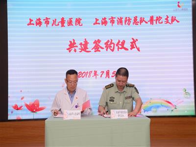 247月5日下午,上海市儿童医院与上海市消防总队普陀支队在泸定路院区5楼报告厅举行了 “应急联勤共建协议”签字仪式。普陀区消防支队政委姜国富、副支队长唐毅、司令部参谋长聂胜辉、政治处主任罗贤刚、防火参谋朱佳沁,儿童医院副院长杨晓东及相关职能科室负责人出席了签约仪式。